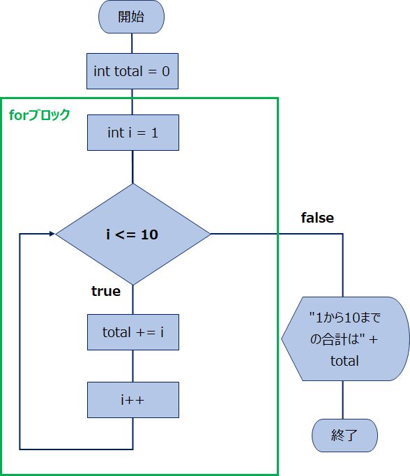 次に、式2で継続条件判定を行い、真だった場合は{}内に移ってtotalという変数にiを加算する処理を行います。