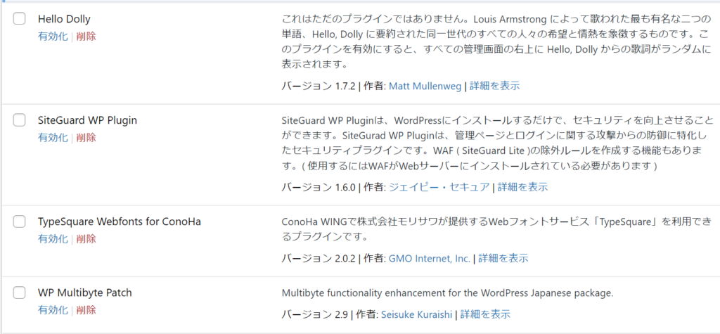 「Hello Dolly」と「TypeSquare Webfonts for ConoHa(各レンタルサーバ名)」は不要なので削除しておきましょう。